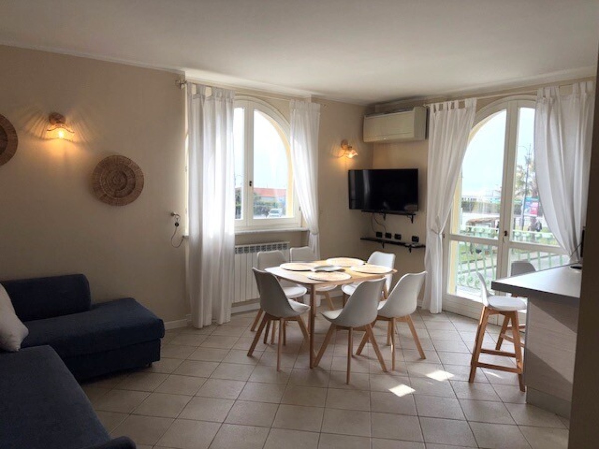 Солнечная квартира напротив моря, приятная обстановка, подобранная со вкусом и практичностью. Немаловажными факторами являются наличие парковки и стратегическое положение в центре города. Просторная гостиная с кухонным блоком.